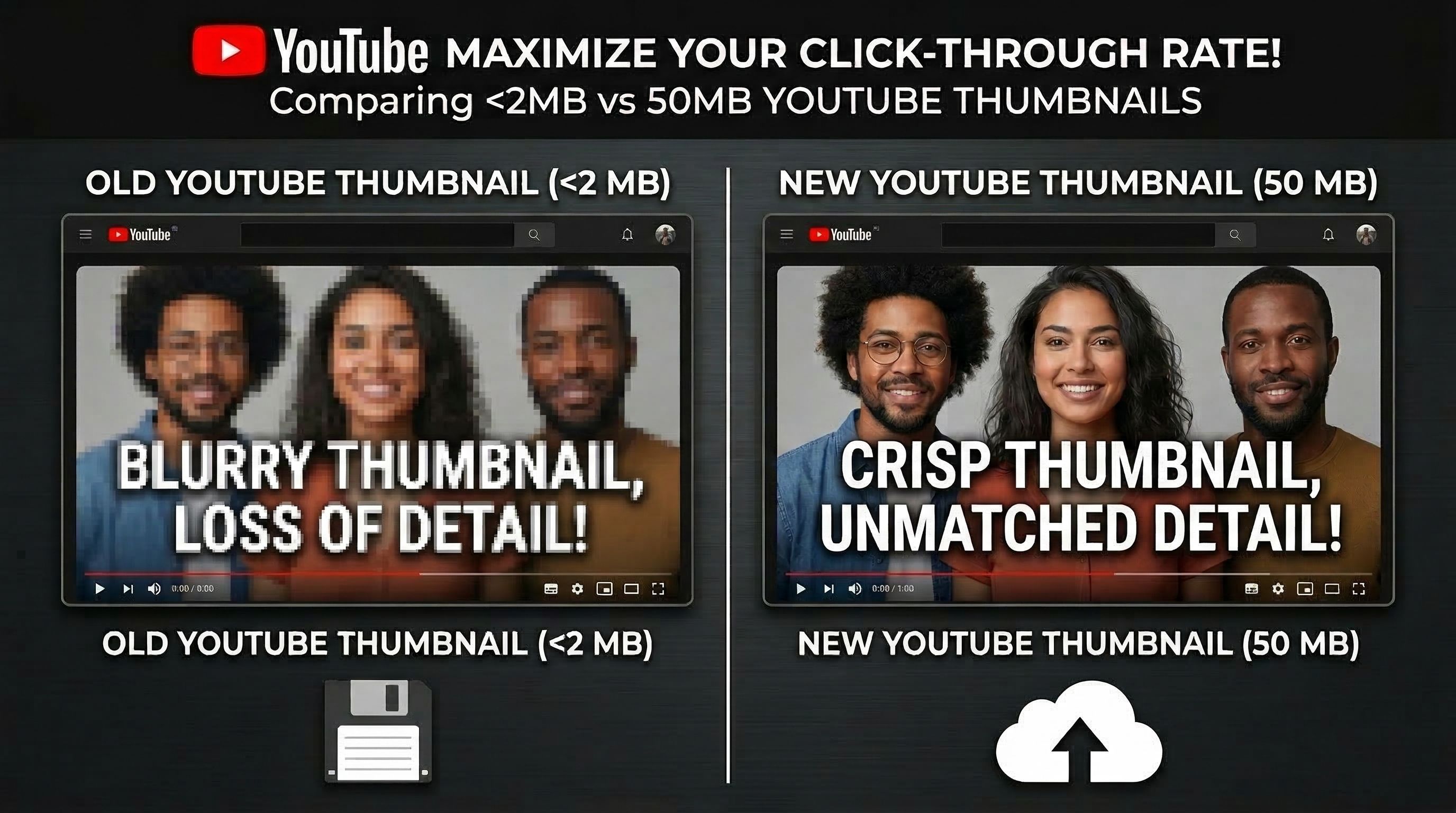 I noticed the differences right away on channels I manage. We uploaded larger image files on new videos immediately. Looking at old thumbnails next to new ones, the old hooks looked slightly pixelated, facial features looked a little hazier, and graphics looked a little fuzzy.